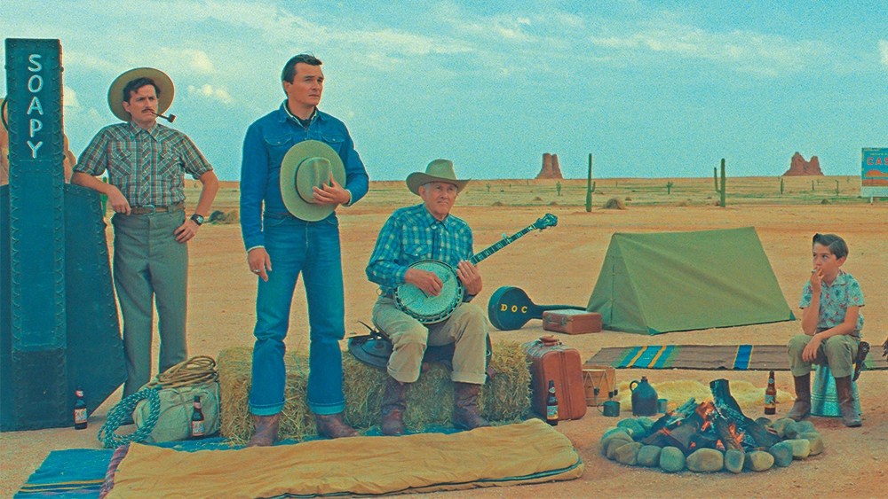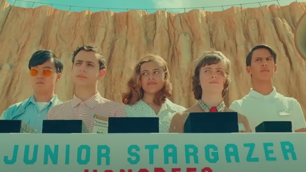 But before Augie can get outer body perspective his time in Asteroid City must be experienced. Here he encounters an array of characters arriving with their own genius children. There is Hollywood actress Midge Campbell (Scarlet Johannson) whose daughter Dinah (Grace Edwards) becomes an immediate attraction for Woodrow. Then there is aggressive J.J. Kellogg (Liev Schreiber) and his son Clifford (scene stealing Aristou Meehan), and the last of the junior stargazers Shelly (Sophia Lillis) and her mother Sandy (Hope Davis). Everyone is overseen by general Grif Gibson (Jeffrey Wright) who spends most of the children’s time parading his own accomplishments and stories. Asteroid City itself a town obsessed with its own history (its claim to fame was an asteroid that landed hundreds of thousands of years ago). But it is the perfect spot for government and scientific experiments as well as the local motel (run by Steve Carrell). Like his last few films Anderson’s cast is extensive but major credit to his writing that not only allows everyone to get their moment he builds a strong emotional bond to nearly everyone. Every performer brings such a gravitas to their role that they become both scene stealers and main focal points all in one. ASTEROID CITY is also Anderson’s most beautiful looking film in years. Robert D. Yeoman’s cinematography is ant antidote for all the too hard to see films of lately. Bright in every frame, the film’s wide scope allows every bit of frontier production design to jump off the screen. Imagine your favorite Road Runner Looney Tunes episode come to life mixed with the Country Bear Jamboree. Hell the film itself stars a jamboree band with some very familiar Anderson veterans.