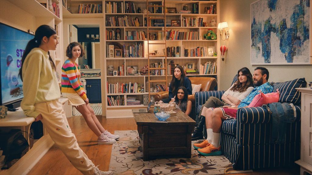 Stacy Friedman (Sunny Sandler) needs a perfect entrance to her Bat Mitzvah, because everyone knows that your entrance defines the rest of the party, and the party defines who you truly are. For a thirteen year old about to make her Bat Mitzvah, Stacy could care less about practicing her haftorah or her Mitzvah project which involves giving back to others. Instead for Stacy and her best friend Lydia (Samantha Lorraine) everything in their lifelong friendship has lead to the party. While her older and cynical sister Ronnie (Sadie Sandler) mocks her and her parents (Adam Sandler and Idina Menzel respectively) want her to focus on what the ceremony truly means they know they are not getting through to their phone obsessed and Olivia Rodrigo inspired teenager. But after all its tough to get through to a teenage girl especially when Stacy is still trying to find ways to fit in with the popular girls who spend their days making “iconic” TikTok’s as well as being noticed by her crush Andy (Dylan Hoffman). All the setups may seem familiar but Sunny Sandler is the shining light that makes this comedy all the more charming. It would be impossible to ignore the fact that she has some of the earnest charm that gave her father a long (an ongoing) career, but unlike the violent rage often displayed by the Sandler patriarch, Sunny’s frustration is rooted in feeling unheard by her family when in reality all they want her to do is connect more with her. Sunny as a performer feels fresh to the business but her skillsets show a possible career following not just her father’s but building her own path of awkward and realistic female roles that are as narcissistic as their male counterparts.