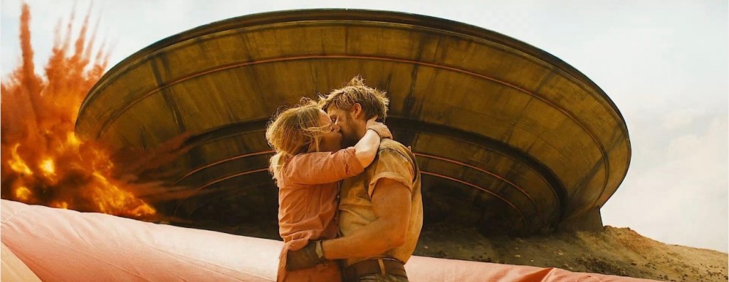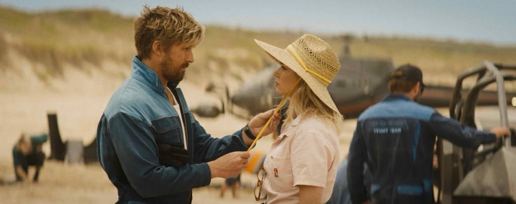 Colt Seavers (Ryan Gosling) falls down a lot. A stunt man for one of the world’s biggest movie stars Tom Ryder (Aaron Taylor-Johnson doing a hilarious bizarre attempt at a McConaughey accent) Colt is there anytime Ryder needs to jump, crash, get punched, set on fire you name it. He’s there for it all. One of the best stunt man in the business Colt loves his job not because he works alongside a huge talent but because work has allowed him to find a connection in Jody (Emily Blunt) a small time camera operator who works on most of the same productions. An early segment allows us to see how every fall and punch is taken with a smile from Colt knowing he gets to talk to Jody immediately after giving his stunt guy thumb up sign of safety. It’s a romance that to Colt is only seen in the movies making it all the more tragic when it ends quickly after Colt gets a serious back injury on a stunt. While the the whole romantic comedy set up of already establishing a relationship isn’t new Gosling and Blunt immediately sell us on their chemistry from quick charming banter to just their doe eye glances that would make any one swoon. This banter continues in a much more cut throat manner when years later Colt, who is now valeting cars gets a chance to be on another Tom Ryder film this time directed by Jody. Using it as a chance to see her again it’s meet with Jody wanting nothing to do with him but like most former super attractive couples who re-connect they can’t stay away from one another whether they like it or not. THE FALL GUY definitely gets in tongue in cheek look at the film industry with Jody directing a big budget sci-fi film that feels Dune one moment and Zack Snyder the next. The work of the art is not as important as getting to Hall H at comic con (one of the films very on the nose but hysterical approaches to a jaded industry).