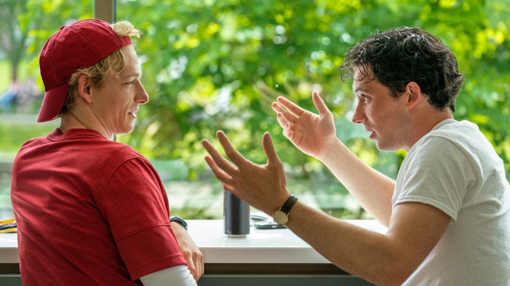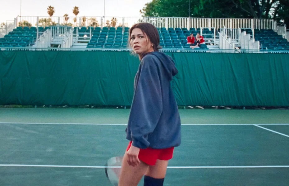Art and Patrick are perfect together. (Mike Faist and Josh O’ Connor respectively). Two young hot shot tennis players in the doubles tournament Art (Mike Faist) is there in front to protect the ball while behind him is Patrick (Josh O’ Connor) ready to blast the ball over the net if Art can’t hold it back. Guadagnino is not being coy about the physical positions of these two men, nor is he when their celebration on the court involves Art wrapping himself around Patrick falling to the ground. There is less humor in their enjoyment of one another and more appreciation for both Guadagnino’s directing and a script by Justin Kuritzkes to show two men who are clearly affectionate for one another without any hesitation. Anyone who has ever played competitive doubles knows the relationship you build with your teammate and Art and Patrick are no different. Their movements are in sync and no more than when they watching someone who Patrick deems “the hottest fucking person alive.” Enter Tashi Duncan (Zendaya) who with exuberant star presence makes it hard to argue with Patrick’s description. Zendaya is a mega star, but that can often grow worrisome of if her abilities as a performer can match the level of fame she has reached. Thankfully and to no surprise Zendaya surpasses these already high standards that unfortunately (or fortunately who knows how she feels) isn’t expected from many entertainers her age. Tashi Duncan is going to take over not just the tennis world, but the world in general and Patrick and Art want every bit of it. When the two practically stampede a first encounter with Tashi the match has already begun. Patrick and his arrogant ways are no match for Tashi who refuses to just go pro but instead get a college education first at Stanford much to Art’s excitement. But the back and forth of their first conversation is nothing to the battle that ensues when Tashi agrees to meet the two boys back at their room. Guadagnino must be a big fan of 90’s adult porn, because most of the wonderful set ups of CHALLENGERS is a tribute to an era of video cassette porn stars, gay pornstars to be more specific. Yes fans of performers like Aaron Austin, Hal Rockland and many more will eat these moments up. (If you don’t know these men then enjoy the homework) But Guadagnino never uses his love for 90’s erotica as a way to be corny or lesser (pornstars are not winning Oscars for their acting mind you) but instead to show how the foreplay and the moments before is all meant to build up tension before that wild release, much like the sports of tennis itself. A moment between these three will define evert movement from their on out. It is a scene that is as exciting as it is dangerous knowing that while two people can finally enjoy themselves there is one that sees opportunity from this all.
