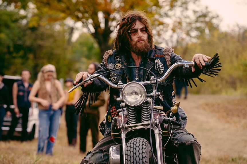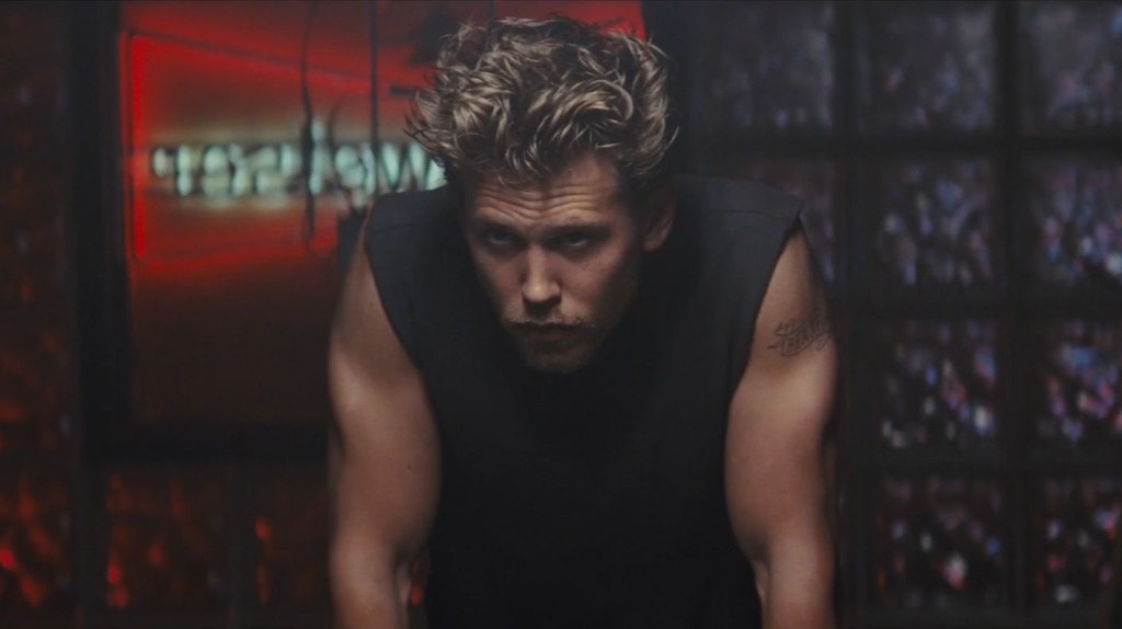 It is impossible not to fall for Benny. At least that is how young Kathy felt. Portrayed by Jodie Comer donning a sixties wig and a fully committed Chicago accent that screams both SNL parody as well as accurate chain smoker renegade. But Kathy is no joke and is not falling just for any old greasy biker as she enters into a dangerous bar where every man looks at her like she’s a freshly painted chopper. Instead Kathy locks in on a mysterious man standing over the pool table. To appreciate the way Jeff Nichols introduces us to Benny and even more so his star Austin Butler, is to be reminded of the first time you laid eyes on James Dean. A high task and even bigger memory, but Nichols using a doo wop song homes in first on Butler’s muscles (already glistening in Adam Stone’s cinematography) then the ripped tank top all the way to his messy blonde as he raises his face and that stoic Butler half smile arises. It is a moment that last twenty seconds tops but feels like an eternity. Butler himself has already become a household name after skyrocketing into fame playing Elvis Presley. But where Baz Luhrmann’s “Elvis” was all about Butler becoming someone else THE BIKERIDERS is partially a film all about becoming Austin Butler the movie star. After a fearful joyride on his bike Kathy doesn’t know what to think so instead she marries him five weeks later. And thus the journey of THE BIKERIDERS fully begins.