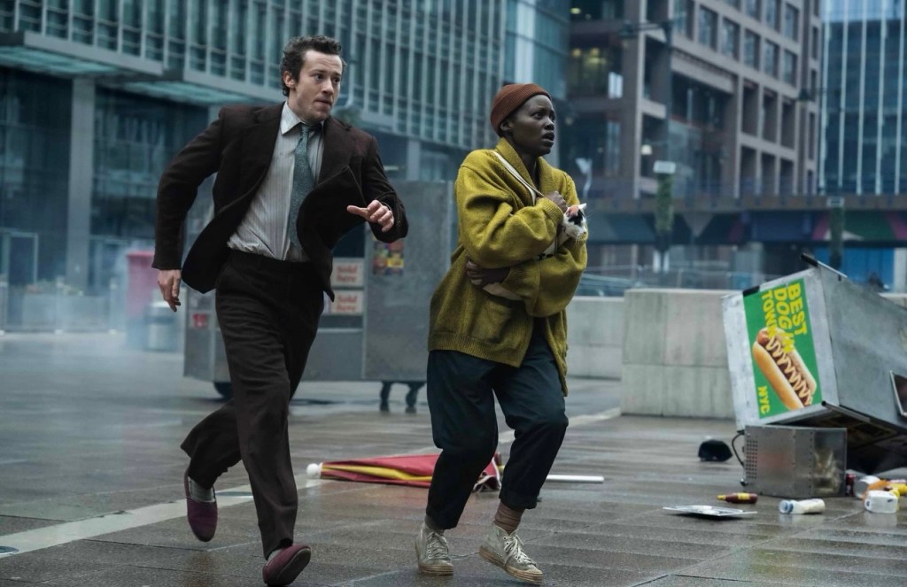 The world is falling apart for Sam (Lupita Nyong’o). A young woman battling a life ending cancer, Sam appears as frail as her willpower. A poet, Sam spends her days in hospice treatment center writing poems titled “Shit” where she explains how her entire world and everyone involved is well “shit.” This includes her nurse Reuben (Alex Wolff) who is just trying to be a friend and get her to re-enter the world illness be damned. One of Reuben’s amusing ways is to bring Sam along on the center’s trip to the city to catch a show much to Sam’s dismay. The idea of New York City is only appealing to her for one reason only; pizza. The city means pizza and nothing is going to stop that promise to herself. Anyone familiar with the “Quiet Place” franchise is aware that the first 2018 film introduced us to an apocalyptic world where the humans must survive amongst noise-sensitive monsters that can end your life even after making a pin drop sound. John Krasinski helmed the first two outings to great success but not without normal online hesitation (too many plot holes, a Spielberg ripoff etc etc.). Regardless of the success or trepidation one thing became aware even after two films, this world building franchise has kind of already hit its wall. When studios become aware of this the next best thing is to bring it to the beginning so while a “Quiet Place” sequel came with some groans the film world was pleasantly curious about a film being helmed by indie rising director Michael Sarnoski. Sarnoski’s film “Pig” starring a mourning Nicolas Cage showed his talents of a patient and empathic director. But Sarnoski being hired for a studio film can still bring worries, after all he wouldn’t be the first indie director to be just a name for the studios and producers to take over. But fear not because Sarnoski’s take on world ending monsters is as bleak but somehow compassionate as his first outing. Sam’s world ending is far more dangerous than any sonic hearing monster.