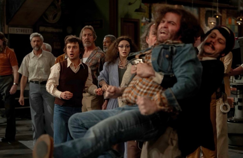 “The show doesn’t go on because it’s ready. It goes on because it’s 11:30.” A quote that appears right in the opening moments of SATURDAY NIGHT becoming a mantra for Reitman’s script which he co-wrote with Gil Kenan. From the moments Michael Lorne steps into 30 Rock (after proving to a security guard he really is a tv producer) the film is off to the races. This is not the SNL biopic so introducing the cast of soon to be comedy legends is not needed nor does it take the time to give the audience a historical backstory of how this all came to be. Instead we are thrust into a world where Chevy Chase ( Cory Michael Smith) pratt falls for laughs (he doesn’t get one), Gilda Radner (Ella Hunt) sweetly encourages everyone, Garret Morris and Jane Curtain (Lamorne Morris and Kim Matula respectively) question why they were even hired and of course John Belushi (Matt Wood) freaks the fuck out. To say this is the best cast film of the year is an understatement and it doesn’t just stop with the SNL players. There’s Rachel Sennott wonderfully bringing her deadpan humor to Rosie Shuster while Cooper Hoffman as Dick Ebersol brings a genuine worry and care for Lorne. And then there is Dylan O’ Brien as Dan Aykroyd nailing every mannerism and voice down to the exact groggy chuckle that you can’t help but what O’ Brien donning the role again for a behind the scenes Coneheads movie. Or even better the Great Outdoors biopic. Here is a film so greatly relying on its performers and thankfully everyone chooses to not do just mimicry but bring a youthfulness back into the spotlight to remind us that no matter where these actors ended up going in the years to come on this night they were truly beyond talented.