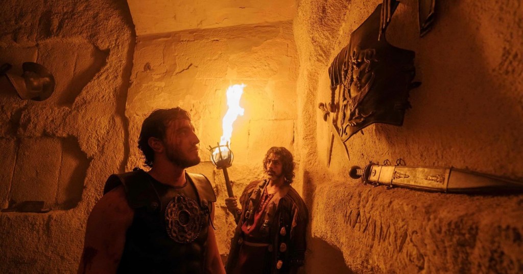 Rome will soon fall again. We are told early on that its has been sixteen years since Maximus stood up to the evil emperor Commodus and killed him. However the dream of a true and just Rome (a dream inspired by the late emperor Marcus Aurelius) is no more and the Roman empire expands its takeover with violence and hatred. For Lucius Paul mescal) this means his home of Numidia is seized by general Marcus Acacius (Pedro Pascal) in the name of Rome and the many casualties (including Lucius’ wife) are just a numeric prize for the powerful empire. GLADIATOR II may feel familiar in story, and to many degrees it is, but quickly destroying the fears of a reboot of such, GLADIATOR II continues the story (even with some slight playful retconning) allowing Lucius the son of Lucilla (Connie Nielsen reprising her role from the original) and Maximus to take on the mantle. However Lucius may bear the name but he wants nothing to do with it (for most of the film he refutes being called the name entirely). Instead vengeance and bloodshed is his path so when he is thrown into slavery and forced to be a gladiator under the tutelage of Macrinus (Denzel Washington) all roads lead to Rome.
