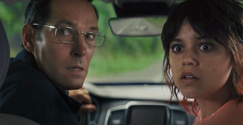 Ridley (Jenna Ortega) doesn’t want to be here. That is her father Elliot’s (Paul Rudd) rental car as they drive through the Canadien Rockies up to wealthy estate of the Leopold family. Elliot, a lawyer, has been summoned there to work on the will of the dying Odell (Richard E. Grant) and get to know his peculiar family including his wife Belinda (Téa Leoni) and their son Shepard (Will Poulter). It’s a dull work trip that Ridley wants no part of especially due to the Leopold’s uber wealth made through pharmaceuticals. For Ridley this is just another bow down to an oppressive organization and while she may be right the dialogue given to Jenna Ortega to express these opinions feels too much like older man writing for young Gen Z kid. A short of ‘how do you do fella kids” if you will. The footing is already off, and while Ridley misses her mom nothing can prepare her for the full on impact that happens next. With her dad distracted by their argument their car hits something head on. Yes the death of the unicorn arrives early but not before Ridley touches its horn and is sent to some sort of portal that looks more like something you’d see on the screen at a Grateful Dead show. This sense of wonder and calmness she feels is immediately overtaken by Elliot beating the creature to death.
