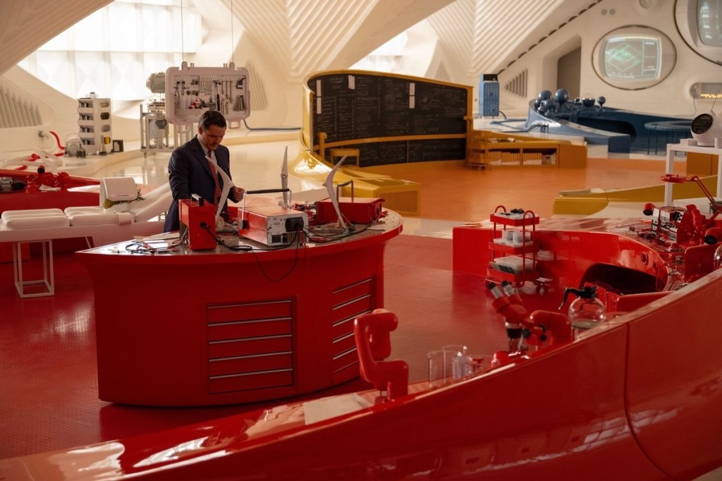 A talk show host walks out to a cheering crowd and states, “Folks we all know the story.” Thirty seconds into director Matt Shakman’s film and it already proclaims some bold statements. FANTASTIC FOUR knows it is technically the fourth time this first family has been brought to the big screen and yet claiming that general audiences knows the story already is quite humorous, especially when followed by a terrific montage that re-introduces us to the Fantastic Four that includes Reed Richards (Pedro Pascal), his wife Sue Storm, (Vanessa Kirby), his best friend Ben Grimm (Ebon-Moss Bachrach), and his brother-in-law Johnny Storm (Joseph Quinn). Four astronauts who were hit with cosmic rays that gave them four very distinct superpowers, Invisibility, limb stretching, fire power and well a rock. The Fantastic Four may be familiar to many but unlike another major superhero film this year, FIRST STEPS refusing to be an origin story that works at first glance until those family bonds start to come into play. Thankfully before we get there FIRST STEPS delivers one of Marvel’s best casts to date. It has been four years since the Fantastic Four have been created and their lives changed forever. Citizens of Earth 828, where 1960’s aesthetic has been kept (thankfully and conveniently none of the prejudice stayed), The Four are celebrities appearing on daytime talk shows, being on the cover of Life Magazine and seen as the greatest cultural icons ever and always at the disposal of the people. Aided by Shakman’s sharp directing and a exuberant blasting score from Michael Giacchino we are given quick glimpses of the Four’s past few years saving the world (but mostly New York) from all sorts of wonderfully ridiculous villains of the week. FIRST STEPS instantly wants us to feel like we have set down in front of our large, boxed TV for a Saturday morning cartoon. And thanks to production designer Kasra Farahani it succeeds. It also helps that since the purchase of Marvel by Disney this feels like the first film in over ten years that carries that same magic you’d find at a Disney park. Brightly lit futuristic sets feel like the better days of Magic Kingdom’s Tomorrowland section. In fact FIRST STEPS gives off such whimsical energy in its first forty minutes that you can practically hear an animatronic start singing “It’s a great big, beautiful tomorrow!” in the background.