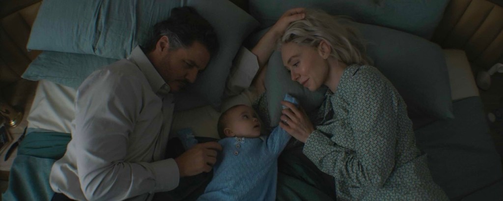 But even with all the exciting visuals at hand, the FANATSTIC FOUR needs to be just as engaging. Pedro Pascal as Reed Richards feels tailormade for the hard working actor with the best agent in town. Pascal with his low voice and slower mannerisms captures Richards inability to hold the same grand emotions of his teammates. With news that Sue is now pregnant his fears of being a father are more analytically immediate wanting to study and observe his wife’s stomach (quite literally). His wife Sue however is able to hold the emotions that most mothers and women feel while also being the rock holding them both down. Kirby herself becomes the glue of the film’s heart. Quinn and Bachrach, while admirable and quite charming in their respective roles get limited time to shine as Johnny and Ben before things start going south for their world. Enter the a herald. In the shape of a flying silver woman with a surfboard (Julia Garner) a warning is given to Earth 828 that the almighty Galactus has chosen their planet for total destruction. Galactus one of the Fantastic Four’s and Marvel’s biggest most cosmic villains is a complicated being to bring to the big screen. The bigger you make him the more threatening he can be while also looking too ridiculous with poor CGI. When the Four encounter him we see that the film has mostly succeeded here. With Galactus’ threat being all too real the Four attempt to reason with him, but when Galactus claims he will end his terror if they give him their unborn child it’s a big no go from everyone. That is until Earcth civilians hear of this and start to ponder (quite angrily) the ethics of just handing over now infant Franklin. These moments of true human frustration and fear give the film some of its strongest moments as it even hits the Baxter building as Reed and Sue argue in a scene that would normally be cut from modern day superhero movies. Between this moment and a fight between Lois and Clark, 2025 may be the year we finally bring back real emotions to the superhero franchise.
