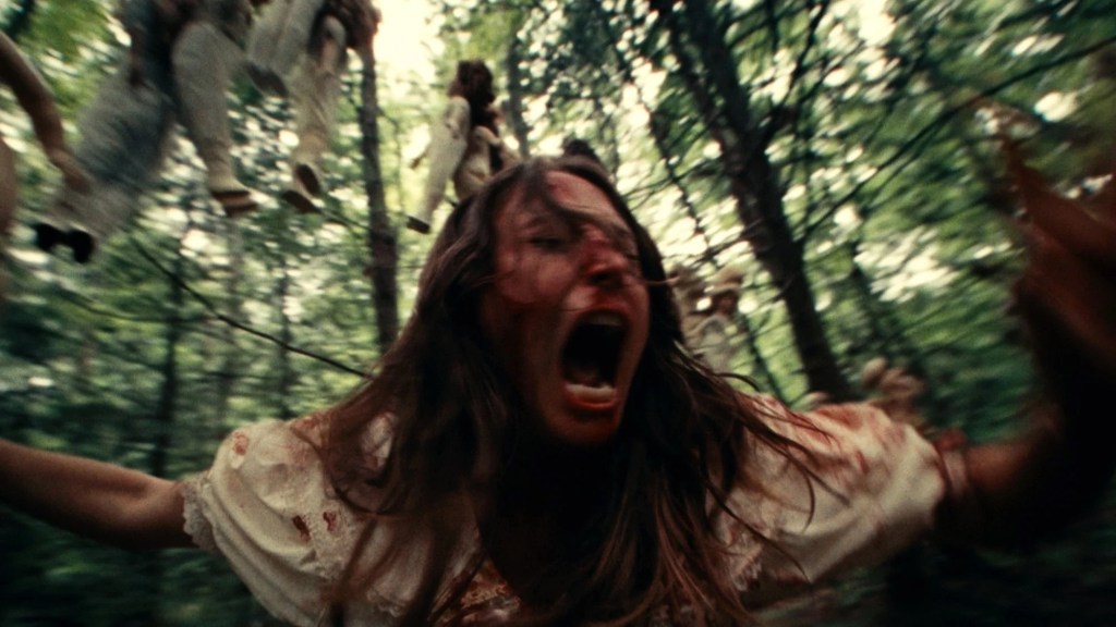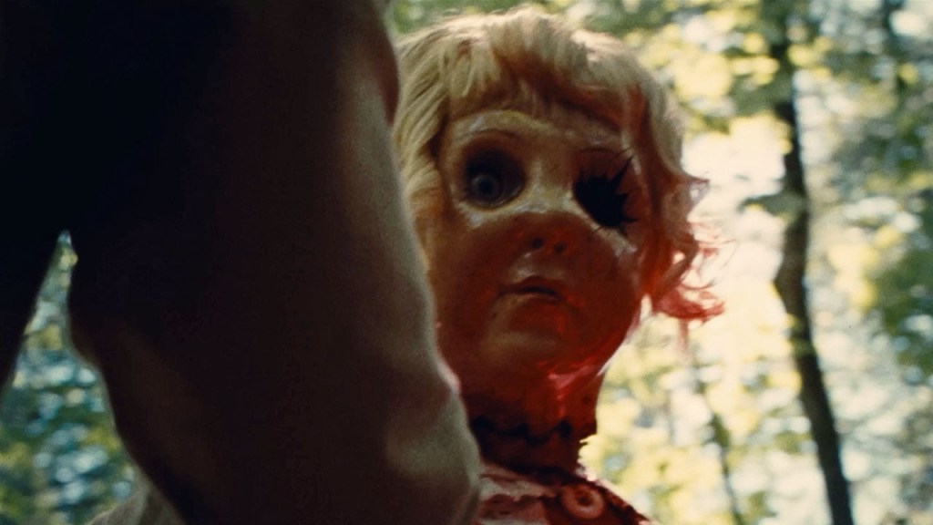Macy (Fabianne Therese) doesn’t want to be a mother. A young woman who is not only afraid that her boyfriend Chase (Seann William Scott) is going to propose to her on their hike today but also that she will now become a step-mother to Chase’s daughter. Chase himself is nervous enough for the proposal that neither of them take full consideration how deep into the woods they are going, that is until they come across some creepy dolls hung up on trees throughout their hike. DOLLY may start off quickly with some conventional “do not go further” humor but what makes it stand beyond just two dumb travelers is that as scary as these dolls are getting ready to propose is far scarier than any porcelain doll. And maybe that’s why they make even the dumber decision to go check out a mysterious noise off the beaten path, but even with all this Blackhurst knows how to sell each moment especially with his actors that already make their poor decisions and gullible behavior all the more endearing. But hey sometimes you fuck around and you find out. It isn’t long (in an already breezy 82 minute movie) before Dolly a mysterious figure with wide shoulders, wearing a round dolls dress and what appears to be a doll’s mask made out of glass appears and takes over. DOLLY is not shy with its violence and in fact it is pretty bloodthirsty delivering an early beat down that will have any avid horror watcher feeling queasy. Dolly themselves portrayed by professional wrestler Max the Impaler, seems destined to become not just a new horror icon but one that will have hardcore fans waiting for a Bloody Disgusting acquisition so they can buy their own masks at a local Spirit Halloween. Art the Clown may have been the takeover last year, but if they play their cards right we could eventually get a Dolly Halloween.