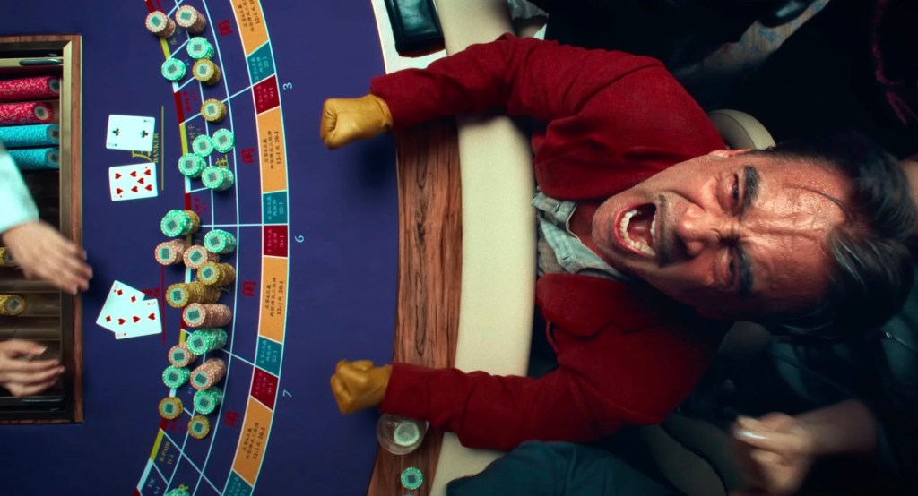 Macau promises its visitors everything while delivering nothing. Rebuilt many decades ago as modern gambling economy Macau has the makings of all the fantasy that an everyday Vegas traveler has come to know. And yet many White foreigners or “Gweilo” come to explore its richness of foreign traditions while ignoring the respect placed upon it. For Lord Doyle (Farrell) Macau is a sanctuary. It is also a place of lies or more so bluffs. Here Doyle can masquerade around as a Lord where people are willing to believe so in order to obtain his wealth and possible good fortune. Farrell is tailor made for Doyle. Stumbling around trying to maintain his swagger decked out in a posh velvet red suit that screams “I had money,” with an emphasis on past tense. Doyle living in the largest suit (full outdoor pool and patio included) in hotel casino guarded by a crystalized Eifel tower. Everything about the Macau gambling world is a copy of a copy, this is not to disrespect the region but rather bring notice to its ability to build its success on allowing others to believe things are real and financial success is just around the corner. James Friend’s cinematography enforces this idea shooting nearly every frame drenched in neon lights while also highlighting the interior decorating that could only combat something you’d unfortunately find in a Trump Towers.